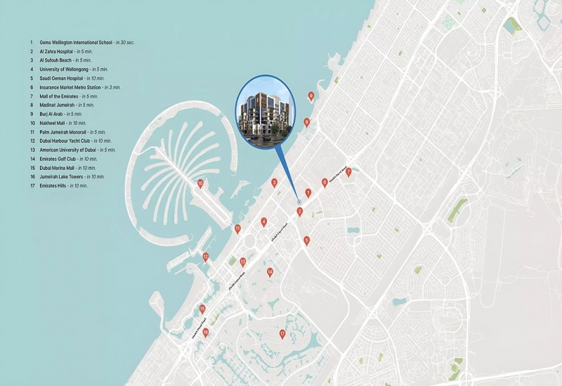 Positioned on Al Safouh Road, the project benefits from one of Dubai’s most connected and sought-after corridors. This prime stretch offers quick access to waterfront destinations, business zones, entertainment landmarks and vibrant lifestyle hubs, making it a fitting choice for individuals and families seeking a location that blends convenience with a serene residential character. The surroundings bring a sense of balance between the dynamism of the city and the calmness of a community-driven environment, allowing residents to enjoy both movement and tranquillity in perfect harmony.