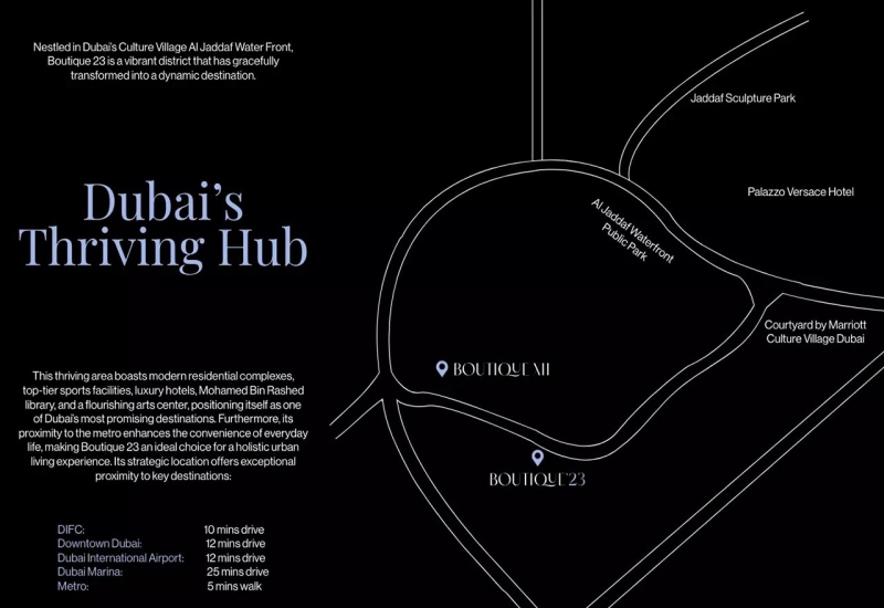 Located in Al Jaddaf, Boutique 23 enjoys excellent connectivity to key destinations across Dubai while retaining a relaxed residential character. The area is known for its proximity to Dubai Creek, cultural landmarks, healthcare hubs, and business districts, making it a highly desirable location for both living and investment. Easy access to major roads and public transport ensures seamless daily commuting, while nearby leisure, retail, and dining options enhance everyday convenience. Boutique 23 stands as an attractive opportunity for those seeking contemporary living in a central location, combining quality, comfort, and long-term value in one elegant address.