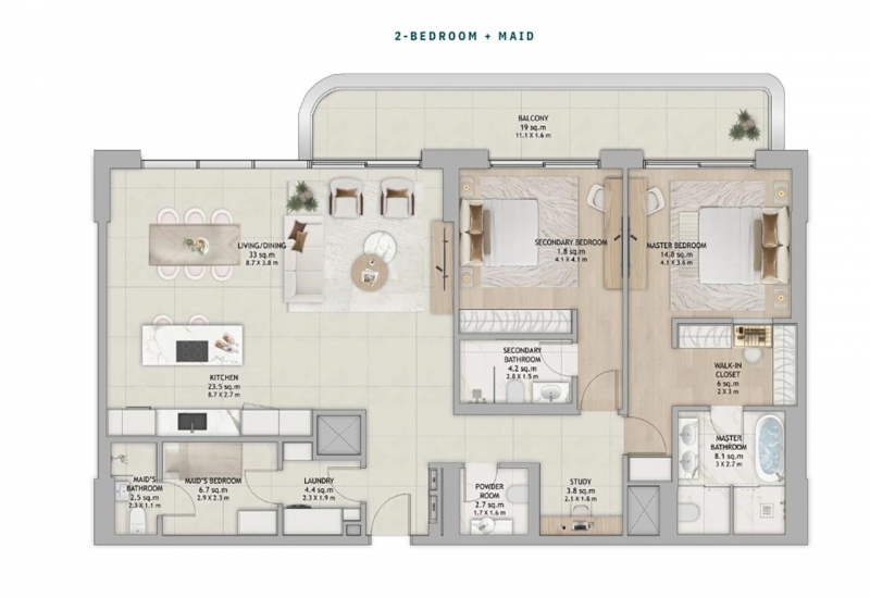 2 Bedroom + Maid Floor Plan