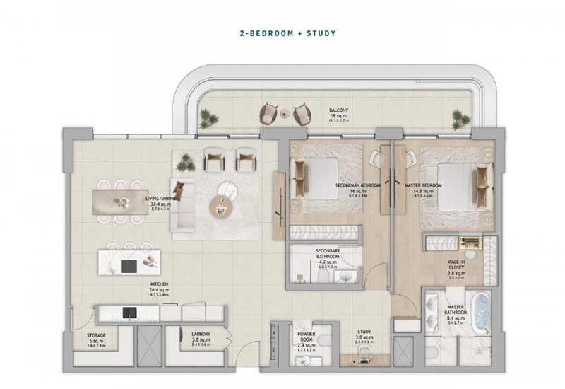 2 Bedroom + Study Floor Plan