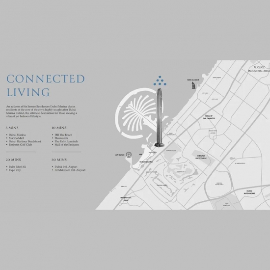 Positioned in the heart of Dubai Marina, the project enjoys proximity to fine dining destinations, luxury retail promenades, pristine beaches, and world-renowned attractions. With seamless access to Sheikh Zayed Road, the metro, and water transport, residents are perfectly connected to every corner of Dubai while still enjoying the exclusivity of an urban sanctuary. Six Senses Residences Dubai Marina by Select Group is more than just a residence—it is a transformative lifestyle destination that sets a new benchmark for wellness-focused living in Dubai’s most vibrant waterfront community.