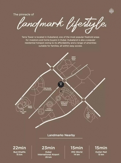 Located in Dubai Land Residence Complex, the project enjoys excellent connectivity to major destinations, business hubs, and lifestyle attractions across the city. The area offers a blend of peaceful residential living and easy access to everyday essentials, making it an ideal choice for those seeking convenience without compromising on comfort. Surrounded by established communities and growing developments, Terra Tower stands as a promising address for the future, offering a lifestyle that merges modernity, accessibility, and a sense of belonging.