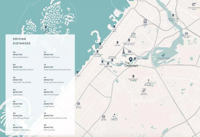 With its prime location in Business Bay, The Crestmark provides easy access to major business hubs, retail destinations, fine dining, and entertainment options, making it an ideal choice for those who wish to be at the heart of Dubai’s thriving urban scene. The Crestmark exemplifies modern living with a touch of sophistication, offering a distinctive residence for every lifestyle.